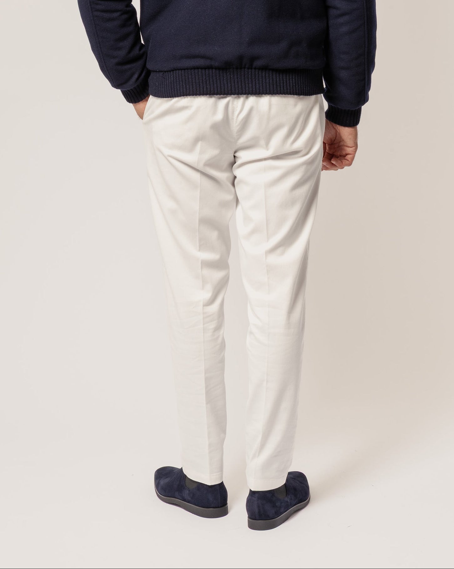 Pantalone con coulisse in vita realizzato in cotone, caratterizzato da un taglio dritto, tasche laterali funzionali e chiusura a finta patta.